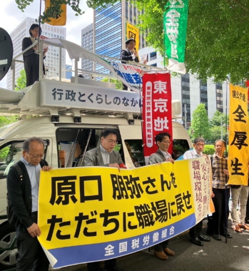 5月28日に、全国税争議団は、全労連・東京地評争議支援総行動を人事院前にて行いました。官民労働組合から56名が結集して、「人事院の不当判定は許さないぞ!」等の抗議を行いました。