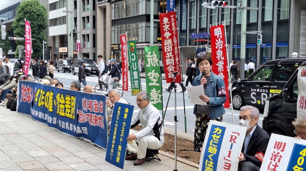 5/19 明治HD前第102次座り込みで挨拶する婦団連小畑会長