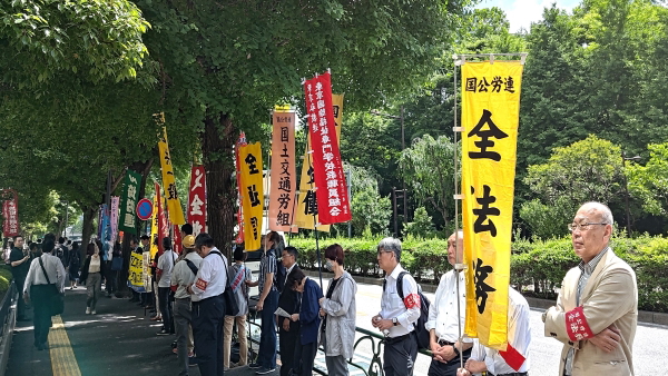 5・28争議支援総行動の最後は、東京地裁・高裁前の全体行動となりました。この数年、最後は東京電力前でしたが、その訴訟で東京地裁が雇止めに対し「不当労働行為意思があったとしても利益追求のための合理化ならやむを得ない」とのとんでない判決を出したこと、その他にもスラップ訴訟の容認、一方的労働条件切り下げを認める判決を連続して出していることに対応したものです。