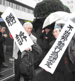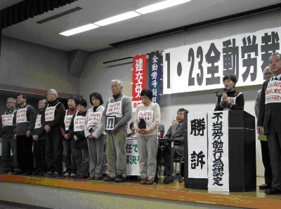 勝利判決を掲げる全動労原告