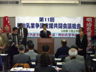去る1月29日、第11回「明治乳業争議支援共闘会議総会」(ラパスホール)が開催され、昨年9月にご逝去された池ノ谷共闘会議議長の遺志を継ぎ、全面解決をめざす方針と新たな役員体制が確認されました。総会では、市川工場事件の最高裁と、都労委での全国事件を攻勢的に闘う方針とともに、「食の安全」をめぐる異常事態を追求して会社包囲を決定的に強め、「08年を全面解決への道筋を切り開く年に!」の方針を確認。