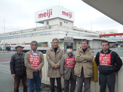 争議団は明治乳業に吸収される明治製菓の菓子部門(全国6工場)への宣伝・要請を重視し、3月中に2回目となる全工場への行動を配置。3月1日には、関東工場への宣伝・要請を、埼玉労連や地元鶴ヶ島・坂戸地区労などの協力を得て15名で実施。多くの婦人労働者らがビラを受け取り対話もあるなど、不安と関心の強さが感じられました。