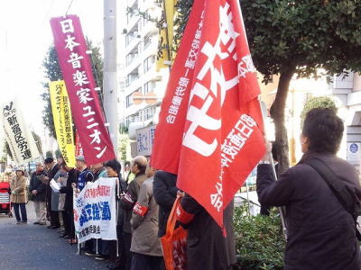 2014年12月3日、音楽ユニオンは全労連・東京地評争議支援総行動にとりくみ、新国立劇場前で集会を行ないました。
